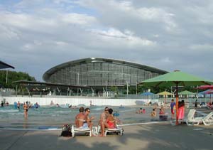 Colourful umbrellas and lounges are dotted about. The lagoon is surrounded by lawns and shady trees, ideal for a picnic.