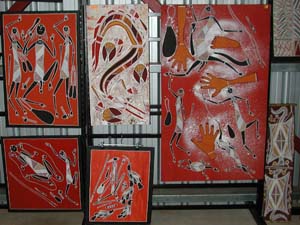 There are numerous distinctive paintings exhibited as well as decorated boomerangs and woven baskets. Traditional Indigenous artwork includes smaller pieces, great for a holiday memento, to larger collectable artworks, all at competitive prices.